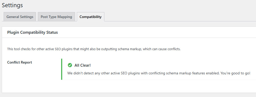 This tab acts as a safeguard. It scans your site for other common SEO plugins (like Yoast, Rank Math, etc.) that also output schema to prevent a common issue: duplicate schema, which can confuse search engines.